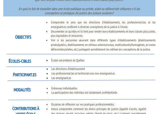 Projet de recherche : La justice scolaire à l’école secondaire : points de vue, pratiques et dilemmes des principaux acteurs éducatifs travaillant avec les élèves